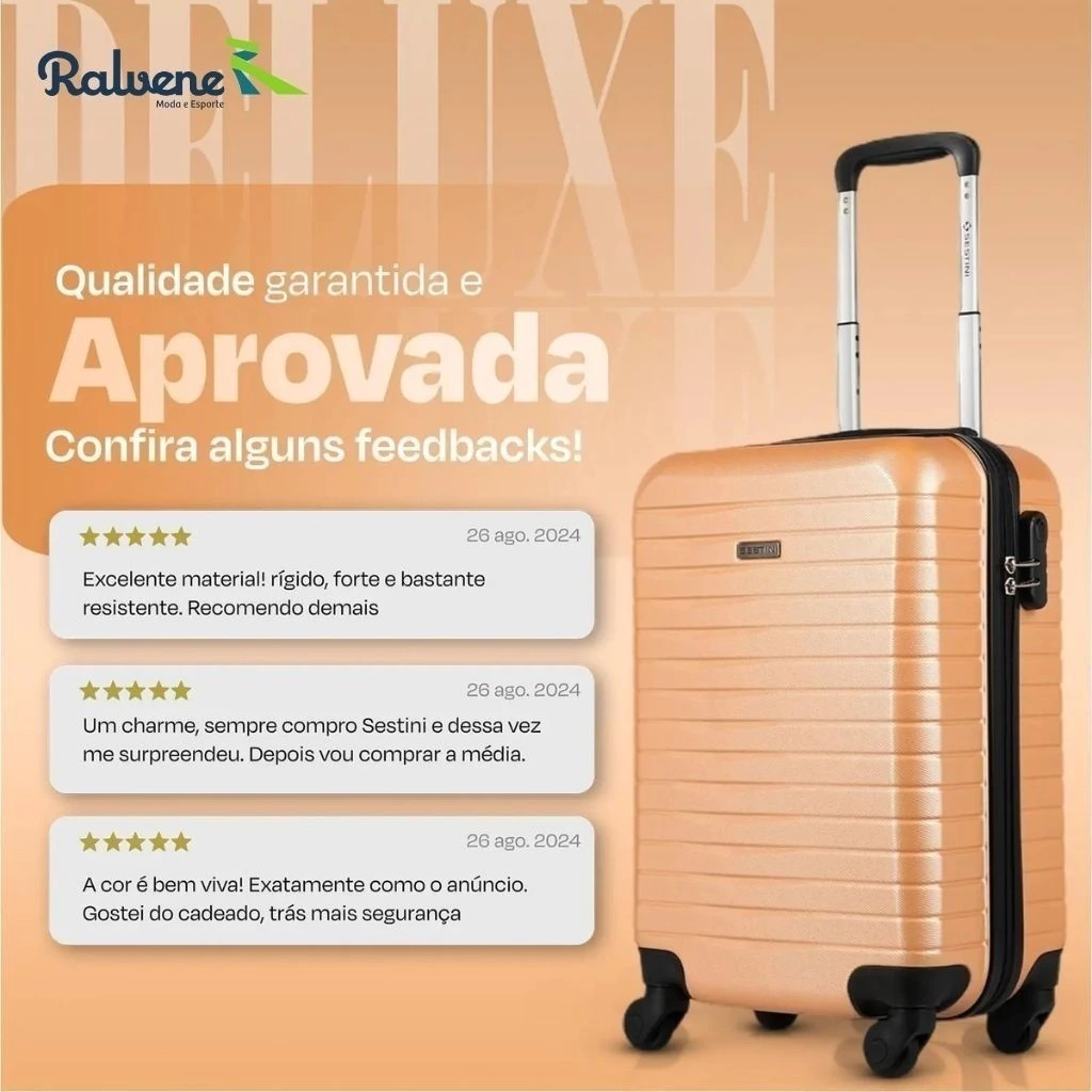A Mala de Viagem Bordo com Rodas 360° Deluxe 20 - Dourado é uma adição elegante e prática à coleção DELUXE, fabricada com material ABS para garantir durabilidade e estilo em suas viagens. Sua estrutura rígida oferece proteção confiável para seus pertences, enquanto as quatro rodas com sistema de giro 360° proporcionam uma movimentação suave e sem esforço em todas as direções.